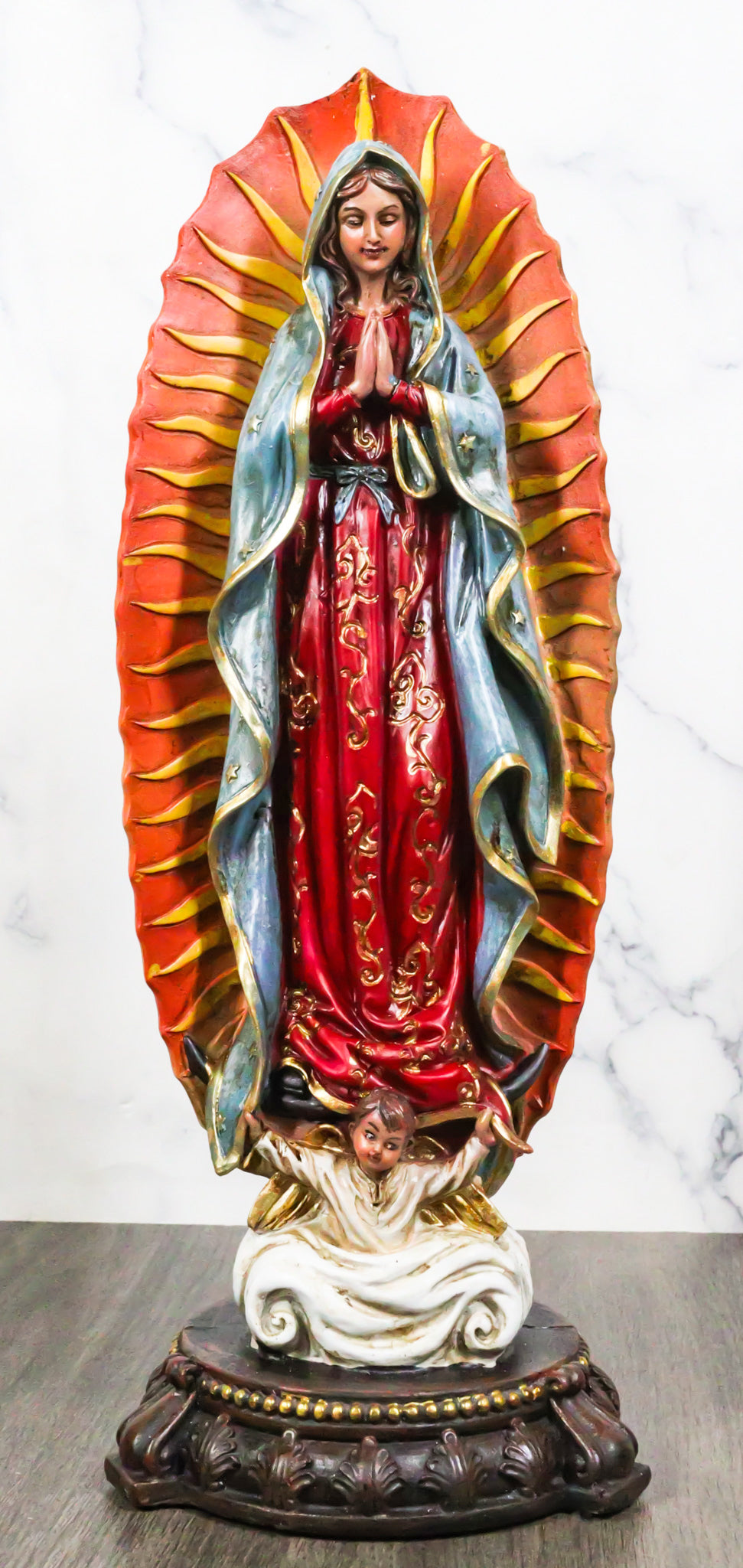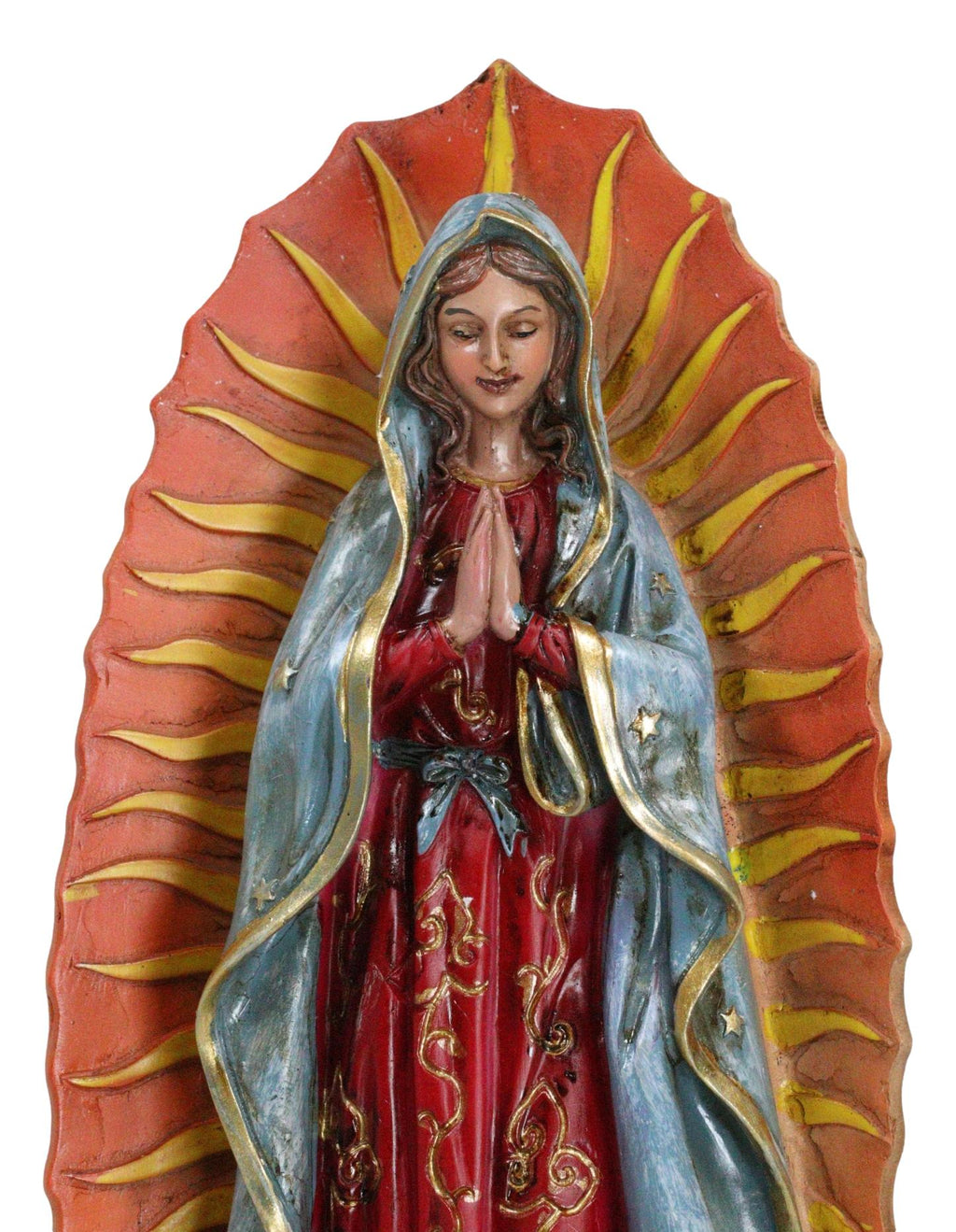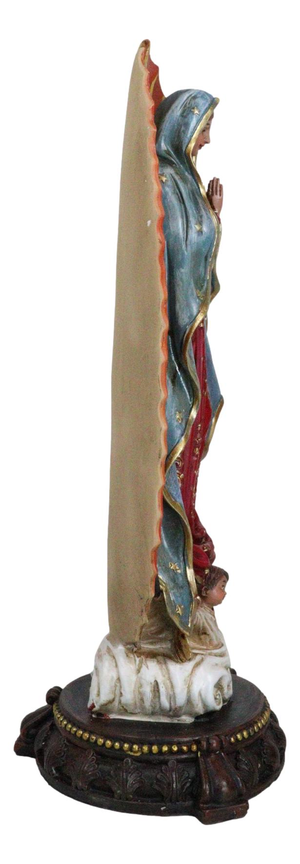 • This Our Lady of Guadalupe Statue measures 13" tall, 4.5" long and 4.5" deep approximately. It weighs about 2 pounds. • This Our Lady of Guadalupe Statue is made of designer composite resin, hand painted and polished individually. Color tone may vary slightly from photos. • Our Lady of Guadalupe appeared to Juan Diego to offer the people of Mexico faith, hope, and consolation. In this elegant statue, the Virgin Mother is portrayed in the classic image of our Lady of Guadalupe where she stands upon the moon, wearing a robe of stars and garments of royal colors. • Props in photos are not included with the item.