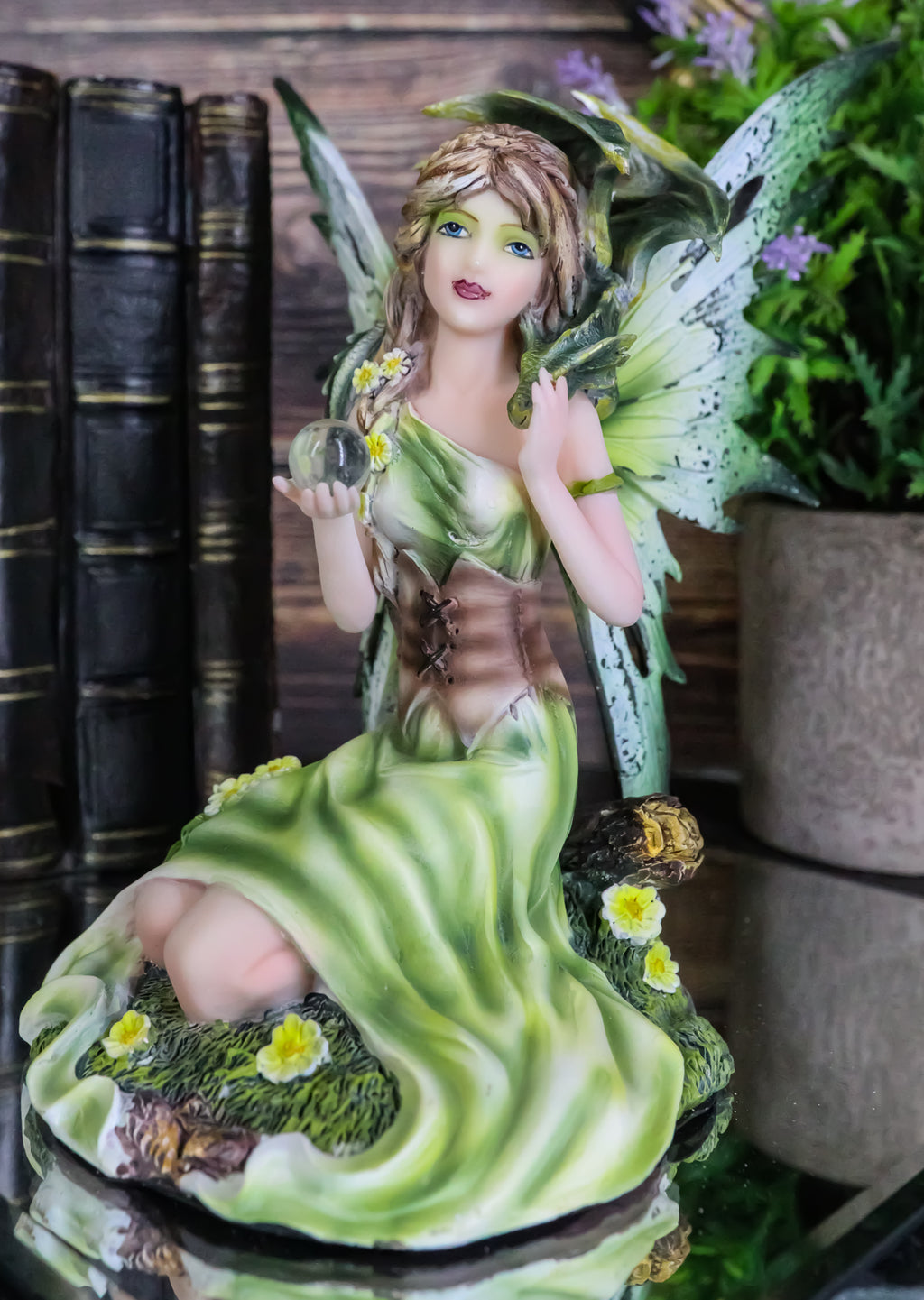 • This lovely figurine will please anyone with a love for the fairies! the statue features a pixie and her green dragon companion. The fae exemplifies summer, and is garbed in shades of pale green and rich brown. Daisies accent her braided hair, and more flowers grow around where she kneels. A striking gift for those who love fantasy!