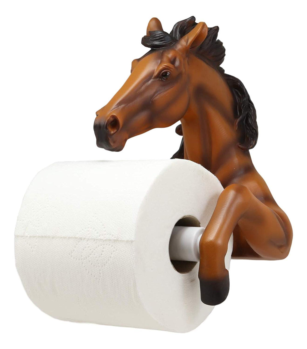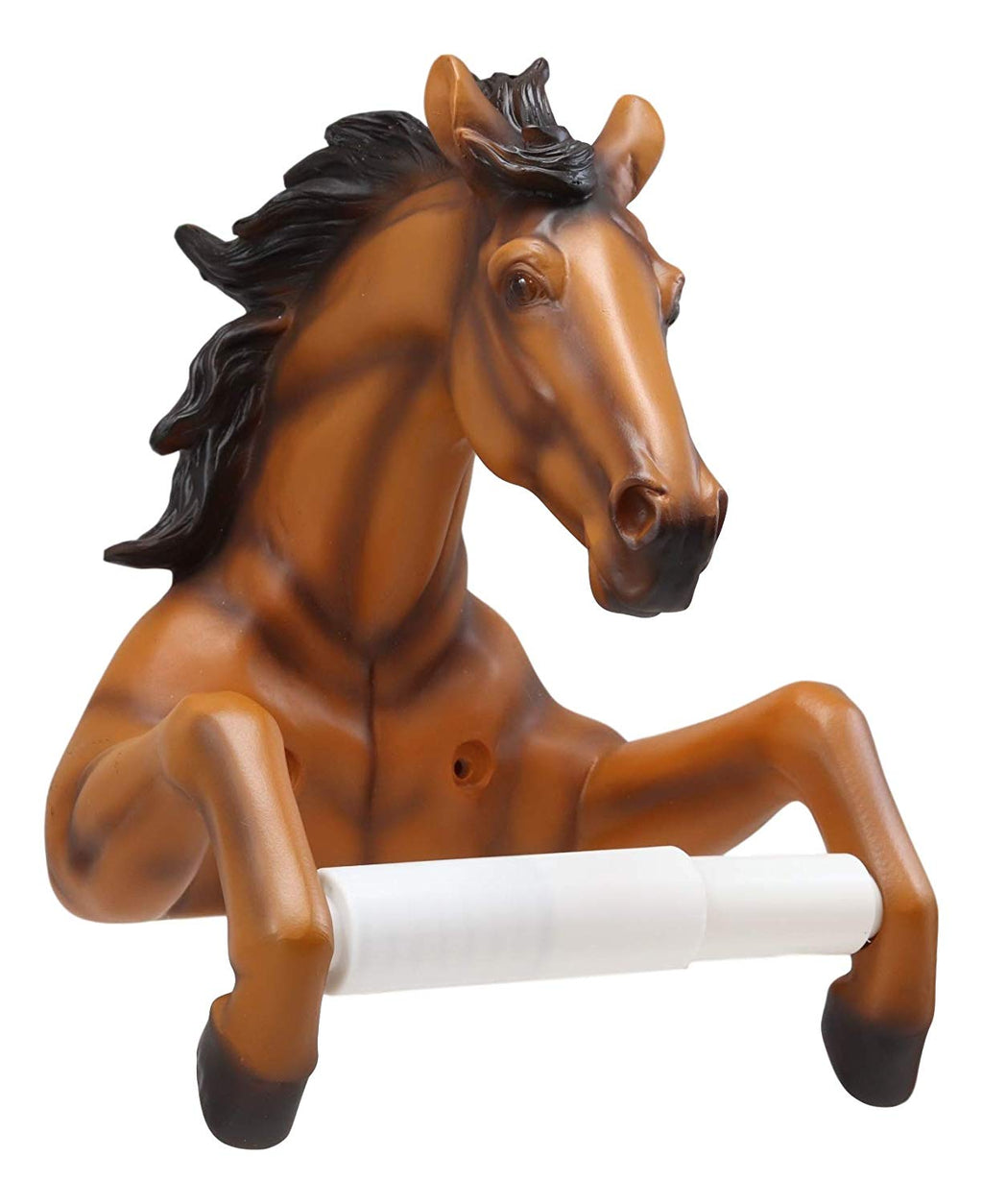 • Could your bathroom use a bit of a western touch? Entertain your guests with this charming chestnut horse toilet paper holder, sculpted with great attention to details. Our Chestnut Brown horse is rearing up for your guests, with his two front legs raised in service of the toilet roll. If anything, this horse will giddy up your guests to finish their 'business' and go!