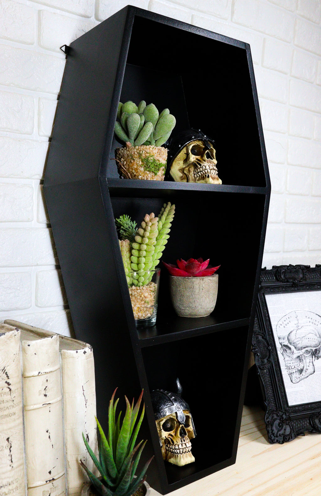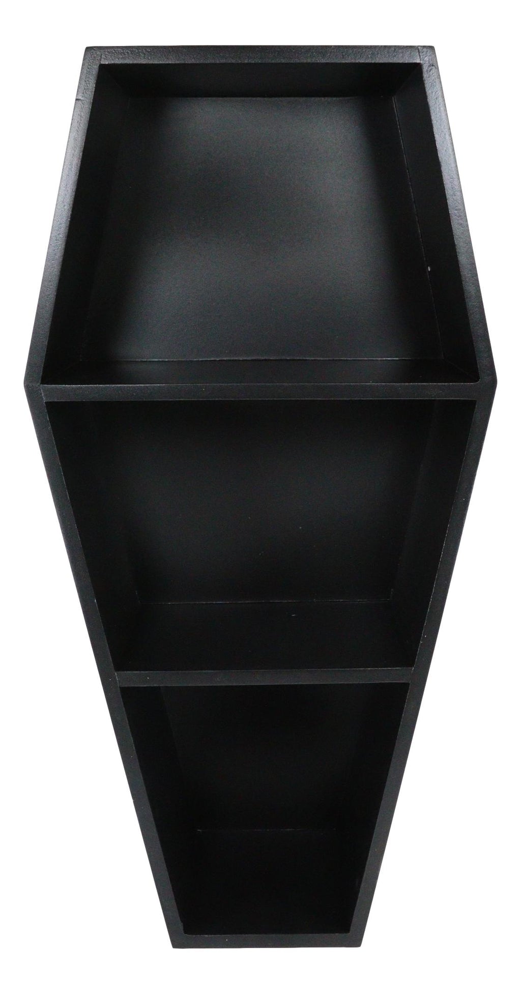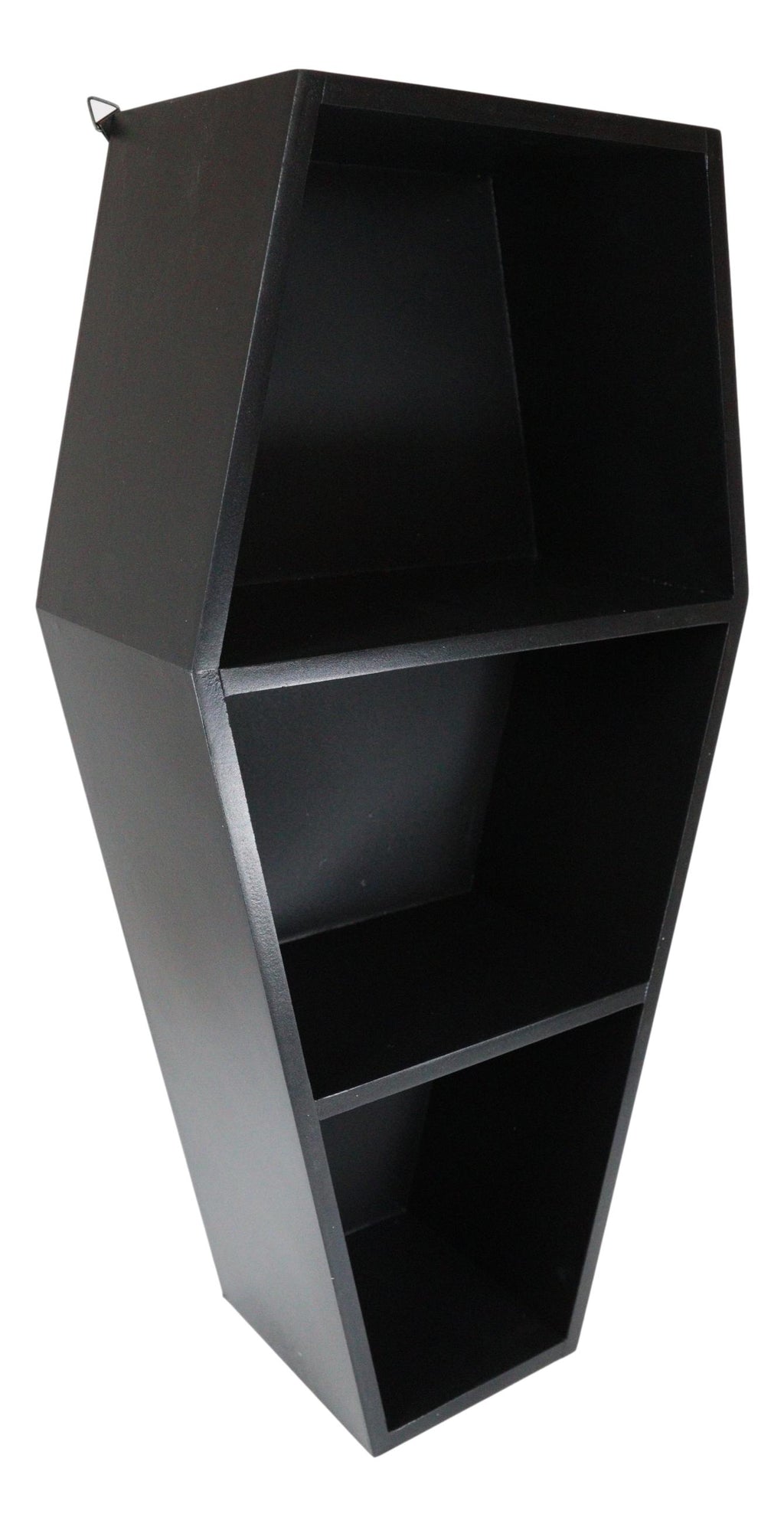 • This coffin-shaped set of shelves provides a great design focal point for any room and is useful for displaying a variety of your most prized possessions, small oddities and taxidermied items.