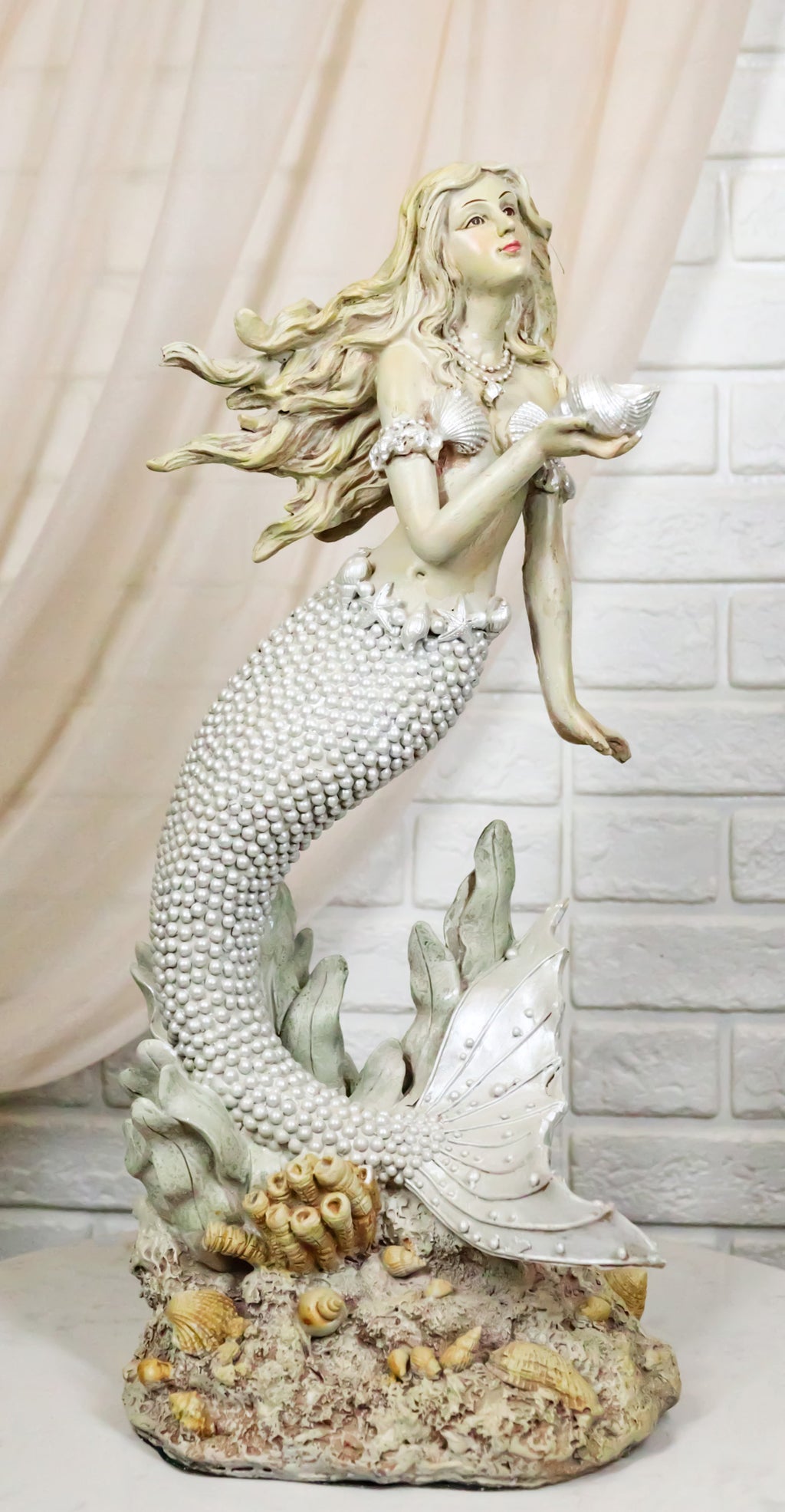 • This beautiful vintage coral reef mermaid figurine measures 15.5" tall, 7.25" wide and 5.25" deep approximately. It weighs about 2.5 pounds. • This beautiful vintage coral reef mermaid figurine is made of designer composite resin, hand painted and polished individually to look vintage. • Elevate your coastal decor with our Vintage Mermaid Figurine. This stunning piece depicts the enchanting sea goddess Venus, adorned with a beaded pearl tail, gracefully holding a sconce. Standing majestically by a coral reef, this figurine captures the timeless beauty and mystery of the ocean. Perfect for coastal and nautical-themed interiors, this exquisite sculpture adds a touch of elegance and whimsy, making it a captivating centerpiece for any home or office. • Props in photos are not included with the item.