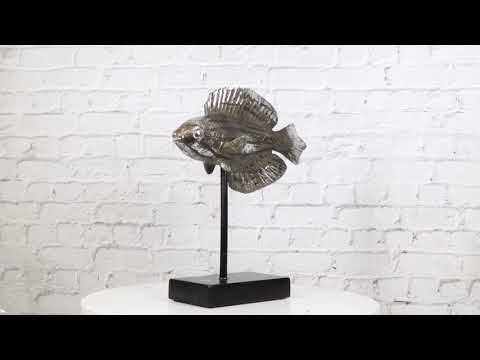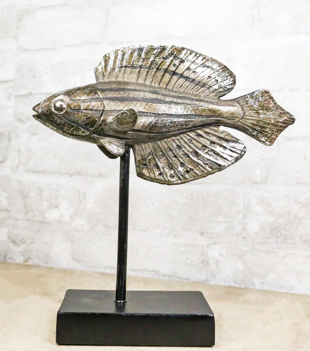 • This Beautiful Marine Wildlife Wrasse Fish Figurine measures 10" long, 10.5" high and 3" deep approximately. It weighs about 1.5 pounds. • This Beautiful Marine Wildlife Wrasse Fish Figurine is made of high quality designer polystone resin, individually handpainted and polished in dark silver finish. • Introducing our exquisite Silver Tone Diamond-Tail Flasher Wrasse Fish Set on a Museum-Style Pole Stand Base, a captivating decorative piece that brings the dynamic beauty of marine life into your home. Each wrasse fish is meticulously crafted with a sleek silver-tone finish, showcasing their distinctive diamond-shaped tails and elegant forms. Mounted on a refined museum-style pole stand base, this set exudes sophistication and artistry, making it a stunning centerpiece for any room. • Props in photos are not included with the item.