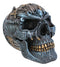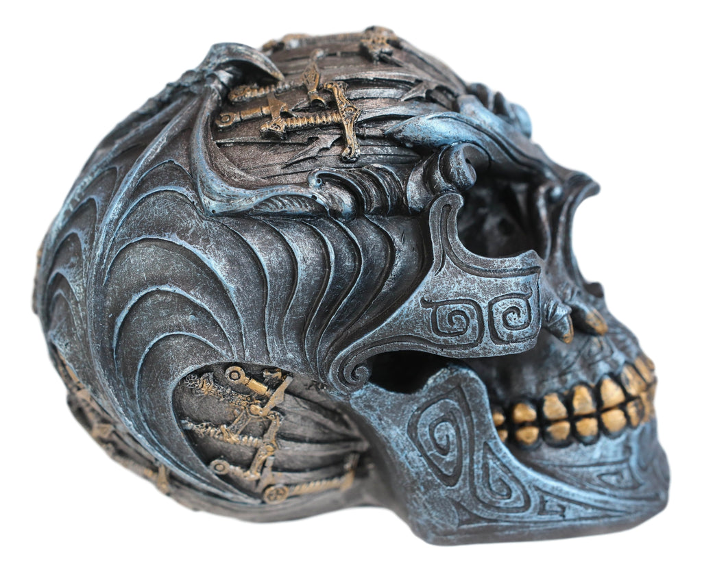 • If you are deep into the fantasy world of dragons, underworld skeletons, zombies and such, then you would have heard about the Valyrian Steel Swords as well as the Iron Throne built form blades and swords. This skull seems armored and clad with relic symbols from the front but as you look at the sides and top, you will be amazed at the details on it. Featuring bat wings and protruding fangs, the skull is embellished with plenty of Valyrian Swords all around! You will love this bizarre skull!