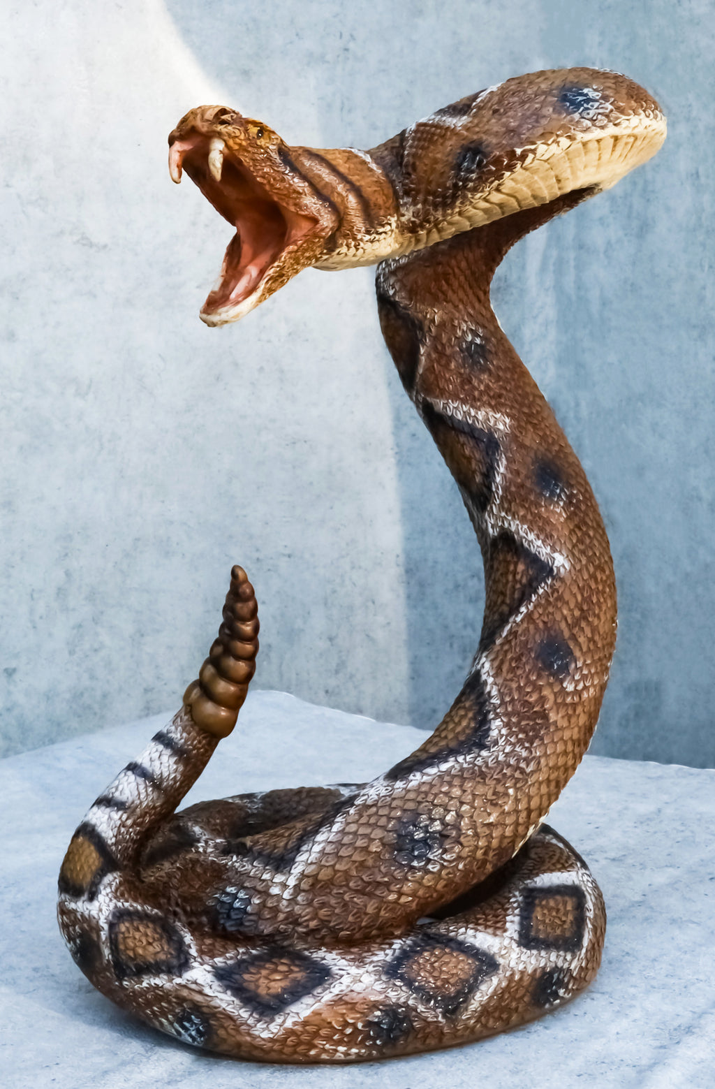 • This Lifelike Diamondback Rattlesnake Sculpture measures 11.5" tall, 8" long and 6" deep approximately. It weighs about 2.5 pounds. • This Lifelike Diamondback Rattlesnake Sculpture is made of designer composite resin, expertly hand painted and polished individually. • Owning a rattlesnake at your residence maybe impossible for most people but owning a realistic looking rattlesnake that will cast awe and fear on your guests is possible now! Our sculptors and painters have done an amazing job to create lifelike details of the snake from its head to its tail. It will pass as a snake taxidermy! • Props in photos are not included with the item.